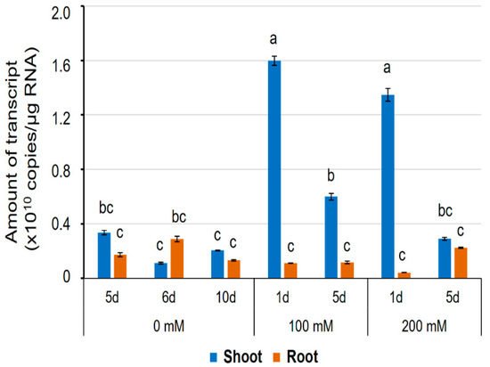 The expression level of the HvPIP2;8 transcripts in a barley cultivar, Haruna-Nijo, detected by qPCR. Five-day-old barley seedlings were prepared by hydroponic culture and further grown on the culture solution with or without NaCl (100 mM or 200 mM) for 1 day or 5 days. Transcript levels of HvPIP2;8 in shoots and roots were investigated by absolute quantification. Absolute amounts of transcripts (copies/µg RNA) were displayed. Significant differences (p < 0.05) are indicated by different letters using one-way ANOVA with Duncan’s multiple comparisons test. Data are the means ± SE, and n = 3.