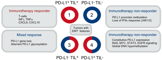 Classification of melanoma tumors based on the degree of T-cell infiltration (TIL) and PD-L1 expression. Categories are aligned with the dominant patient response and mechanisms responsible for high or low/absent PD-L1 expression. Note that tumors with epithelial-to-mesenchymal transition (EMT) features can be found in any of the four groups.