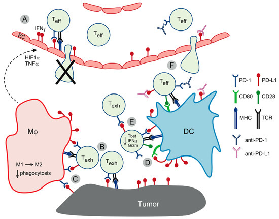 Endothelial cell expression of PD-L1 plays a role in resistance to anti-angiogenic therapy, as anti-angiogenic therapy synergized with PD-1/PD-L1 blockade in several preclinical models of cancer [20,53]. Furthermore, anti-angiogenic therapy combined with anti-PD-1 facilitated the formation in the tumor tissue of highly specialized capillaries known as high endothelial venules (HEVs), structures normally present in lymph nodes where they serve as dedicated sites of T-cell homing, likely indicative of the development of tertiary lymphoid structures within the tumor [20]. Thus, PD-L1 expression by the tumor vasculature plays a role in limiting access and restricting the function of T-cells that enter the tumor tissue.