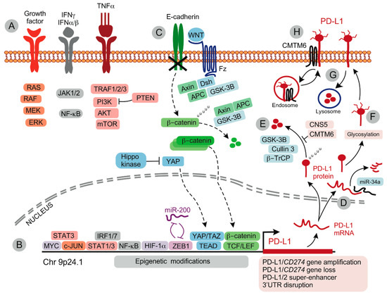 Regulation of PD-L1 expression in tumor cells. (A) Signaling via growth factor-, IFN- and TNFα receptors activates multiple signaling pathways that induce PD-L1/CD274 gene expression. (B) Multiple transcription factors can induce PD-L1 expression. PD-L1 gene amplification or loss and epigenetic modifications modulate PD-L1 gene expression. (C) In de-differentiated cells undergoing epithelial-to-mesenchymal transition (EMT), loss of E-cadherin drives cytoplasmic translocation of β-catenin that is subject to ubiquitination/destruction by the Axin/APC/GSK-3B complex. Activation of Wnt/Fz/Dsh sequesters the β-catenin destruction complex and allows for the accumulation and nuclear translocation of β-catenin; β-catenin associates with TCF/LEF transcription factors to induce PD-L1 expression. ZEB1 (subject to control by miR-200) and YAP/TAZ-TEAD complexes maintain PD-L1 expression in de-differentiated phenotypes. (D) Upon transcription, PD-L1 mRNA is subject to regulation by miRs such as miR-34a. (E) PD-L1 protein is unstable, being rapidly ubiquitinated by GSK-3B and cullin 3/β-TrCP, and degraded. This process is antagonized by CNS5 and CMTM6. (F) Glycosylation increases PD-L1 protein stability. (G) Cell surface-expressed PD-L1 is internalized and undergoes lysosomal degradation. (H) Alternatively, interaction with CMTM6 stabilizes PD-L1 expression by supporting endosomal recycling and preventing proteolytic degradation. Abbreviations: APC, Adenomatous polyposis coli; β-TrCP, Beta-transducin repeats-containing protein; CMTM6, CKLF-like MARVEL transmembrane domain containing 6; CNS5, COP9 signalosome 5; Dsh, Dishevelled; Fz, Frizzled; GSK-3B, synthase kinase 3 beta; HIF-1α, Hypoxia-inducible factor-1α; NF-kB, Nuclear Factor kappa B; mTOR, mammalian target of rapamycin; MYC, Avian myelocytomatosis virus oncogene; PI3K, Phosphoinositide 3-kinase; PTEN, phosphatase and tensin homolog; STAT, signal transducer and activator of transcription; TCF/LEF, T-cell specific transcription factor/lymphoid enhancer binding factor; TEAD, TEA domain family member; TRAF, TNF receptor associated factor; WNT, wingless; YAP, Yes-associated protein; ZEB1, Zinc finger E-box-binding homeobox 1.