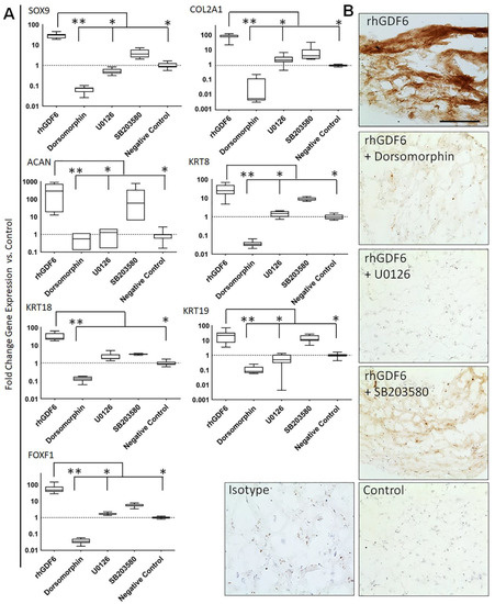 - Clarke, L.; McConnell, J.C.; Sherratt, M.J.; Derby, B.; Richardson, S.M.; Hoyland, J.A. Growth differentiation factor 6 and transforming growth factor-beta differentially mediate mesenchymal stem cell differentiation, composition, and micromechanical properties of nucleus pulposus constructs. Arthritis Res. Ther. 2014, 16, R67. [Google Scholar] [CrossRef]
