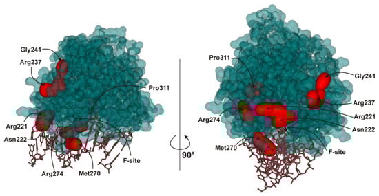 Numerous studies of the direct interactions between proteins participating in BER are described in detail elsewhere [,,,,,]. The obtained data indicate that efficient repair of damaged DNA in the BER pathway proceeds via a tightly coordinated action of enzymes, where a preceding enzyme remains bound to its end-product DNA until it is displaced by the next enzyme in the reaction chain []. Nevertheless, the mechanisms of the substrate channeling and activity regulation within the BER pathway are still poorly understood in kinetic and structural terms. It seems that rather than being assembled into one stable multisubunit BER complex, these enzymes pass the repair intermediates among themselves by forming transient protein–protein complexes []. In this regard, it remains unknown how amino acid substitutions in the form of single-nucleotide polymorphisms (SNPs) in relevant proteins would affect the efficiency of the whole DNA repair pathway. Indeed, SNP-derived amino acid substitutions in BER enzymes are widespread in the human population. It should be noted that a decrease in a functional activity of individual BER enzymes and the disruption of either the coordination between them or coordination with accessory proteins can have many negative consequences. The roles of non-synonymous SNPs in the protein-coding region of BER genes in disease susceptibility have already been discussed in a number of publications [,,,,,,,,,,,,,,]. Therefore, in the present study, we performed comparative analysis of the efficiency of DNA substrate channeling between various BER proteins and either wild-type (WT) APE1 or its natural polymorphic variants. We tested human DNA glycosylases responsible for the initiation of the BER pathway in the case of guanine oxidation (human 8-oxoguanine-DNA glycosylase; OGG1), cytosine deamination (human uracil-DNA glycosylase; UNG2), and purine alkylation (human alkyladenine-DNA glycosylase; AAG) as well as downstream enzyme Polβ and accessory proteins XRCC1 or PCNA to evaluate the influence of these proteins on the activity of APE1. Seven SNP variants of APE1 (R221C, N222H, R237A, G241R, M270T, R274Q, and P311S) were used for the kinetic analyses of the interaction with a DNA substrate containing a stable analog of an abasic nucleotide (F site) in the presence of various BER proteins. Spatial location of the affected amino acid residues was formally subdivided into several groups: surface amino acid residues Arg221, Asn222, Arg237, and Gly241; amino acid residues located near the DNA-binding site (Arg221, Asn222, Met270, and Arg274); and an inner residue: Pro311 (Figure 1).