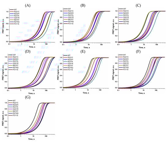 Interaction of WT APE1 or its SNP variants with the FRET-labeled substrate. The FRET signal changes characterize the activity of WT APE1 and SNP variants without any effectors (A) or in the presence of AAG (B), OGG1 (C), UNG2 (D), Polβ (E), PCNA (F), or XRCC1 (G).