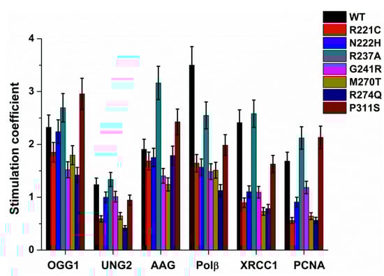 A comparison of stimulation coefficients f of BER proteins between APE1 WT and its SNP variants. The stimulation coefficient is computed according to Equation (2). [WT APE1 or SNP variant] = 10 nM, [FRET-F substrate] = 1.0 μM, [effector protein (AAG, OGG1, UNG2, Polβ, PCNA, or XRCC1)] = 1.0 μM.
