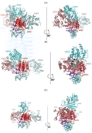 Protein–protein docked models of APE1 complexes with BER enzymes: OGG1 (A), AAG (B), UNG2 (C), Polβ (D), or PCNA (E). The PDB structures employed for the docking are 1DE8 for APE1, 1EBM for OGG1, 1F4R for AAG, 1EMH for UNG2, 4PHD for Polβ, and 6FCM for PCNA.