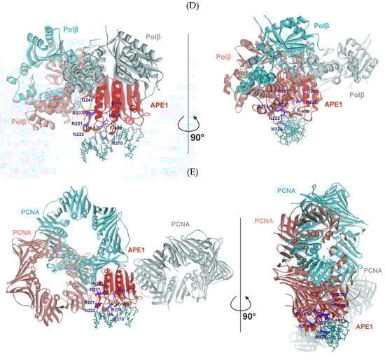 Direct protein–protein interactions between APE1, DNA polymerase β (Polβ), and accessory proteins poly(ADP-ribose) polymerase 1 (PARP1), XRCC1, and tyrosyl-DNA phosphodiesterase 1 (TDP1) have been analyzed by fluorescence-based approaches []. These data have revealed strong protein–protein binding affinities. The physical interaction between APE1 and Polβ has been detected by various approaches [,,]. It has been reported that downstream enzymes Polβ and XRCC1 stimulate the endonuclease activity of APE1 [].