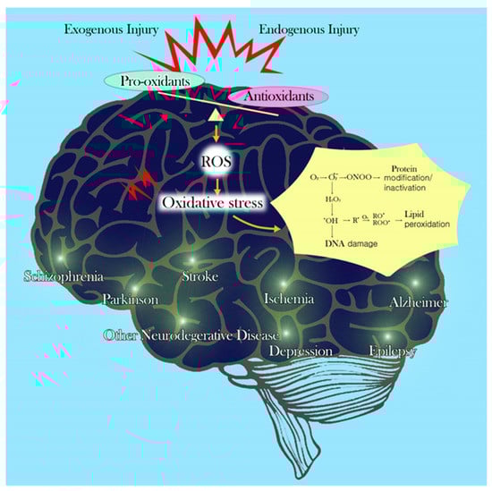Free radicals or other reactive molecules disturb cellular energy metabolism and cause oxidative stress. Endogenous redox imbalance by pro-oxidant and antioxidant agents occurs as a result of free radicals, which play an important role in oxidative stress, cell death, and tissue damage. Increased free radical production due to excess pro-oxidant mechanisms can react with lipids, proteins, nucleic acids, and other biomolecules which can alter their structure and function. A high concentration of polyunsaturated fatty acids exists in membrane lipids in the brain []. These are sources of decomposition reaction in the form of lipid peroxidation, in which a single initiating free radical can precipitate the destruction of adjacent molecules. Polyunsaturated fatty acids especially serve as major biological targets for oxidative damage induced by ROS. Other candidate molecules that serve as biological targets of free radicals are nucleic acids. Breaks in DNA or modified bases can result in aberrant gene expression and cell death []. Moreover, free radicals can also oxidize the backbone and side chains of proteins, thereby disrupting the function of enzymes, receptors, neurotransmitters, and structural proteins by oxidative modification []. Highly reactive oxygen radicals are produced in the brain as a result of interactions between various transition metals and their reducing equivalents. Transition metals including iron, copper, zinc, and manganese, are associated with increased free radical production by the Fenton reaction [,]. Since the brain has abundant lipid content, high energy requirements, and weak antioxidant capacity, it is an easy target for excessive oxidative insults. Specifically, ROS increase susceptibility to neuronal damage and functional decline via brain oxidation in Alzheimer’s disease (AD), Parkinson’s disease (PD), amyotrophic lateral sclerosis (ALS), cerebrovascular disorders, psychiatric disorders, and other neurodegenerative diseases [,,] (Figure 1).