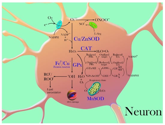 Enzymatic antioxidant defense system against the production of reactive oxygen species (ROS). Various pathways of cell death caused by ROS and its transformation are observed in brain injury. NADPH oxidase and mitochondrial respiratory transport chain are known as major cellular sources of the superoxide radical anion (O2−). The superoxide radical anion reacts with nitric oxide (NO) to form the peroxynitrite anion (ONOO−) which mediates oxidative modification of protein residues via an interaction with NO. The superoxide radical is dismuted by the superoxide dismutase enzyme (SOD) to form hydrogen peroxide. In addition, manganese containing superoxide dismutase (Mn-SOD) reduces the superoxide radical anion generated during the electron transport chain in the mitochondrial matrix. Catalase (CAT) and/or glutathione peroxidase (GPx) decomposes hydrogen peroxide to water and oxygen by enzymatic reactions. Hydrogen peroxide is decomposed into reactive hydroxyl radicals by reaction with catalytically active redox metals such as (copper and iron). Hydroxyl radicals can react with oxygen to form peroxyl or alkoxyl radicals which can lead to lipid peroxidation and react with DNA and primarily cause damage to DNA. Peroxiredoxins (Prx) and thioredoxin (Trx) act as redox-regulated proteins to additional redox relay bases.