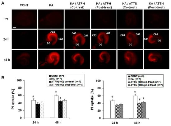 Neuroprotective effect of vitamin E. (A): Representative propidium iodide (PI) images. When hippocampal slices were exposed to 5 μM KA for 15 h, PI uptake in the CA3 region was significantly higher than the CA1 region. Co-treatment using ATPH (100 μM) or ATTN (100 μM) with KA significantly reduced PI uptake in the CA3 region compared with KA treatment alone. (B): Quantification of PI intensity. * p < 0.05, # p < 0.05; one-way ANOVA followed by Dunnett’s post hoc comparison (* p < 0.05 vs. normal, # p < 0.05 vs. KA-treated cultures). This present data is a part of our previous research showing neuronal rescue after oxidative stress by alpha-tocopherol and tocotrienol treatment []. Abbreviations: ATPH, alpha-tocopherol; ATTN, alpha-tocotrienol; OHSC, organotypic hippocampal slice culture; KA, kainic acid; PI, propidium iodide; DCF, dichlorofluorescein.