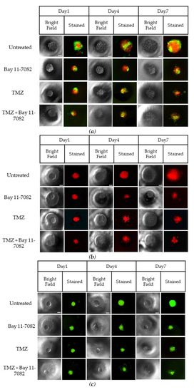 For the first 7 days, we co-cultured LN229 cells and astrocytes with a ratio of 1:1 (Figure 1b), mono-cultured LN229 (Figure 1c), and astrocytes (Figure 1d) in the microwells to generate 3D spheroids. In this study, we used 600 µM of TMZ and 10 µM of Bay 11-7082 concentration on day 7 and cultured 3D spheroids for an additional 7 days since astrocytes have been found to be more TMZ resistant [40,41].