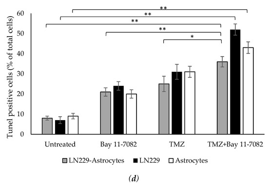 In addition to cell viability assay, we further investigated how drugs affect the cell apoptosis. Therefore, we performed TUNEL assay. Co-cultured and mono-cultured cells were treated with or without TMZ and Bay 11-7082 and subjected to TUNEL assay to detect DNA damage (Figure 3a–c). The results showed that TUNEL (+) cells in the co-treatment in the co-culture were increased 4.5-fold compared with the untreated and 1.71- and 1.44-fold compared with TMZ alone and Bay 11-7082 alone, respectively (p < 0.01) (p < 0.05) (Figure 3d). TUNEL (+) cells in the co-treatment in the LN229 mono-culture were increased 7.42-fold compared with the untreated (p < 0.01) and 2.16- and 1.67-fold compared with TMZ alone and Bay 11-7082 alone (Figure 3d). TUNEL (+) cells in the co-treatment in the astrocytes mono-culture were increased 4.77-fold compared with the untreated (p < 0.01) and 2.15- and 1.38-fold compared with TMZ alone and Bay 11-7082 alone (Figure 3c).