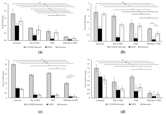 Gene expression analysis. Fold changes of (a) glial fibrillary acidic protein (GFAP), (b) vimentin, (c) Notch-1, and (d) survivin genes in the co-culture and mono-cultures. LN229 cells and astrocytes were treated with or without drugs for 7 days. Results were normalized to GAPDH total RNA level. Data represent the mean ± SD of three biological replicates. * indicates p < 0.05, ** indicates p < 0.01.