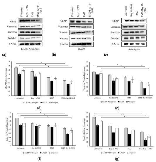 We performed Western blotting to analyze the expressions of GFAP, vimentin, Notch-1, and survivin proteins in the TMZ and/or Bay 11-7082 treated co-cultured and mono-cultured cells (Figure 5a–g). 3D spheroids in the mono-culture without drug treatment were used as the control group and all protein levels were normalized to β-actin housekeeping gene.