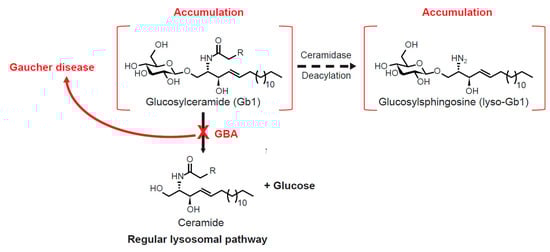 There are at least three adaptations in Gb1 metabolism that occur during GBA deficiency—namely, the increased anabolism of Gb1 to gangliosides, excessive transglycosylation by cytosol-faced retaining β-glucosidase GBA2, and the active deacylation of Gb1 by acid ceramidase to lyso-Gb1 (the latter pathway is illustrated in Figure 1) [7]. The differential activation of these pathways may account, at least in part, for the inconsistencies observed in the translation of the GBA genotype, lipid storage deposition, and GD phenotype [6]. Variable alterations in lipid metabolism secondary to Gb1 (and lyso-Gb1) accumulation may also induce multiple pathologies reflected in phenotypic heterogeneity [34].