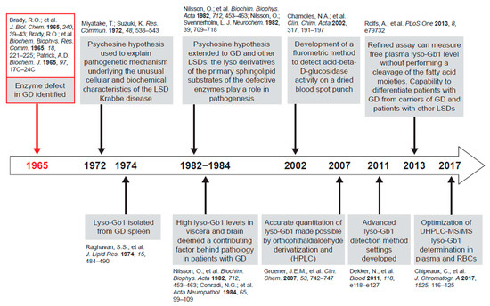 - Orvisky, E.; Park, J.K.; LaMarca, M.E.; Ginns, E.I.; Martin, B.M.; Tayebi, N.; Sidransky, E. Glucosylsphingosine accumulation in tissues from patients with Gaucher disease: Correlation with phenotype and genotype. Mol. Genet. Metab. 2002, 76, 262–270. [Google Scholar] [CrossRef]