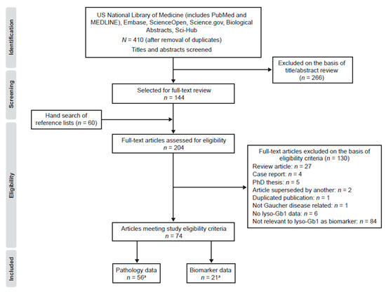 The literature searches on lyso-Gb1 and GD identified 410 articles (Figure 3). During title and abstract screening, 266 articles were excluded according to study exclusion criteria. One hundred and forty-four articles were retrieved in full text, and an additional 60 articles meeting inclusion criteria were identified from hand searches of reference lists from full text articles. Of the 204 articles that were reviewed in full text, 130 were excluded, primarily owing to article type or for their lack of relevance to lyso-Gb1 as a biomarker for GD. Thus, 74 articles met the study eligibility criteria and were included in the review. Of these, one was a randomized clinical trial, one was a pooled analysis of phase III trials, 29 were non-randomized clinical trials or observational studies, and 48 were preclinical studies (five publications reported both preclinical and clinical data).