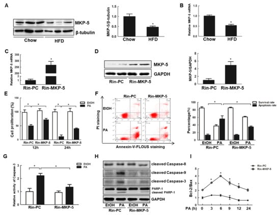 Overexpression of mitogen-activated protein kinase phosphatase-5 (MKP-5) relieves the apoptosis of Rin-m5f cells upon palmitic acid (PA) exposure. (A) Representative pancreatic MKP-5 expression in mice fed high-fat diet (HFD) or chow as measured by Western blotting (male mice; n = 7 per group, left). Levels of MKP-5 were quantified and normalized to β-tubulin in these same mice (right). (B) The expression of MKP-5 in islet cells from mice fed HFD or chow was measured by real-time PCR (male mice; n = 7 per group). (C,D) The Rin-PC and Rin-MKP-5 cell lines were constructed, and the level of MKP-5 was measured by real-time PCR (C) and Western blotting. ((D), Left) Levels of MKP-5 were quantified and normalized to glyceraldehyde-3-phosphate dehydrogenase (GAPDH) ((D), Right). (E) The cell proliferation of Rin-PC and Rin-MKP-5 cells treated with PA for 12 and 24 h was measured via 3-(4,5-dimethylthiazol-2-yl)-5-(3-carboxymethoxyphenyl)-2-(4-sulfophenyl)-2H-tetrazolium, inner salt (MTS) assay. (F) The apoptotic ratios of the cells following a 24 h palmitic acid (PA) treatment were quantified based upon Annexin V and propidium iodide (PI) staining results. (G) Caspase-3 activity was measured using Ac-DEVD-PNA in Rin-m5f cells exposed to PA for 24 h. (H) Levels of cleaved Caspase-9, cleaved Caspase-8, cleaved Caspase-3, and cleaved poly (ADP-ribose) polymerase-1 (PARP-1) in Rin-PC and Rin-MKP-5 cells treated with PA for 9 h were measured via Western blotting. (I) The relative levels of B-cell lymphoma-2 (Bcl-2)/ Bcl-2 associated X protein (Bax) were measured by real-time PCR in Rin-m5f cells treated with PA for the indicated times. *, p < 0.05, Rin-PC vs. Rin-MKP-5; EtOH vs. PA; HFD vs. chow.