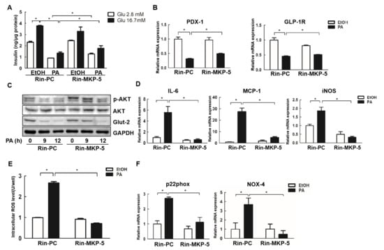 MKP-5 decreases inflammation, oxidative stress, and preserves the function of Rin-m5f cells in response to PA treatment. (A) Glucose-stimulated insulin secretion (GSIS) responses were determined by ELISA in Rin-MKP-5 and Rin-PC cells treated with PA for 24 h. (B) The relative mRNA expression of pancreatic duodenal homeobox factor-1 (PDX-1) and glucagon-like peptide-1 receptor (GLP-1R) were measured by real-time PCR in Rin-m5f cells upon 12 h PA treatment. (C) The protein levels of p-AKT, AKT, and Glut-2 were determined in Rin-PC and Rin-MKP-5 cells upon PA stimulation for 9 h and 12 h. (D) Expression of the inflammation-related genes inducible nitric oxide synthase (iNOS), interleukin-6 (IL-6), and monocyte chemotactic protein-1 (MCP-1) were detected by real-time PCR in Rin-m5f cells upon PA exposure for 12 h. (E) Levels of PA-induced intracellular reactive oxygen species (ROS) in Rin-PC and Rin-MKP-5 cells were determined using a fluorescence microplate reader by measuring DCFH-DA-fluorescence. (F) The expression of the ROS-related genes p22phox and NADPH oxidase-4 (Nox-4) was analyzed by real-time PCR. *, p < 0.05, EtOH vs. PA; Rin-PC vs. Rin-MKP-5; Glu 2.8 mM vs. Glu 16.7 mM.
