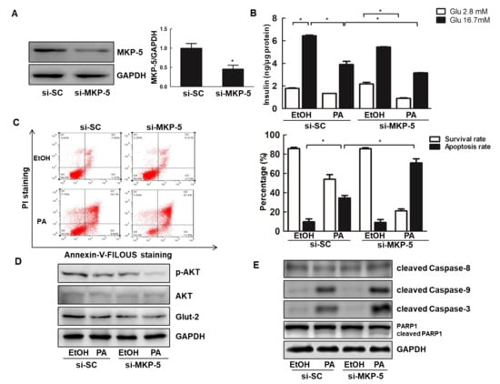 Knockdown of MKP-5 aggravates Rin-m5f cell apoptosis and dysfunction upon PA treatment. (A) The expression of MKP-5 was assessed via Western blotting in Rin-m5f cells transfected with si-RNA against MKP-5 (si-MKP-5) or scramble siRNA control (si-SC) for 72h. (B) GSIS responses were determined in Rin-m5f cells transfected with si-MKP-5 upon PA treatment for 16 h. (C) The ratios of apoptotic Rin-m5f cells treated with PA for 16 h were quantified by flow cytometry using an Annexin V-FLOUS and propidium iodide (PI) double staining kit. (D,E) Rin-m5f cells transfected with si-SC or si-MKP-5 were exposed to PA for 9 h. The expression of AKT, p-AKT, and Glut-2 was determined via Western blotting (C). The levels of AKT, p-AKT, and Glut-2 were analyzed by Western blotting. *, p < 0.05, si-SC vs. si-MKP-5; EtOH vs. PA; GLU 2.8 mM vs. GLU 16.7 mM.