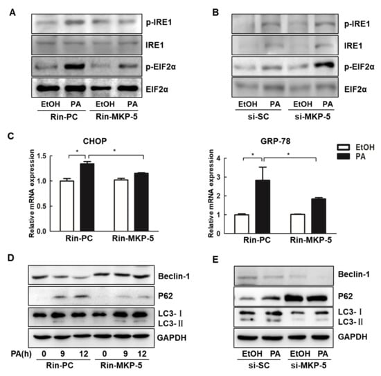 MKP-5 rescued PA-induced endoplasmic reticulum stress (ERS) and autophagy inhibition in Rin-m5f cells. (A) The levels of ERS-related proteins were analyzed by Western blotting in Rin-PC and Rin-MKP-5 cells treated with PA for 9 h. (B) The levels of ERS-related proteins in Rin-m5f cells transfected with si-SC or si-MKP-5 following PA treatment for 9 h were measured by Western blotting. (C) The mRNA levels of C/EBP-homologous protein (CHOP) and glucose-regulated protein-78 (GRP-78) in Rin-PC and Rin-MKP-5 cells following a 12 h PA treatment were detected by real-time PCR. (D) The levels of autophagy-related proteins were measured via Western blotting in Rin-m5f cells upon PA treatment for 9 and 12 h. (E) The levels of autophagy-related proteins were measured via Western blotting in Rin-m5f cells transfected with si-SC or si-MKP-5 at 9 h post-PA treatment. *, p < 0.05, EtOH vs. PA; Rin-PC vs. Rin-MKP-5.