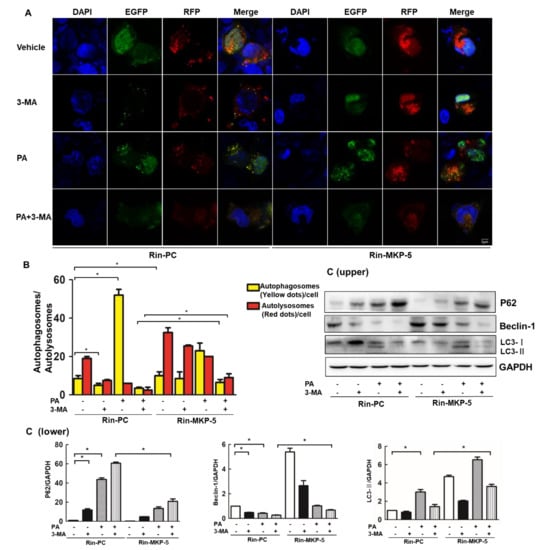 MKP-5 regulates the PA-induced impairment of autophagic flux in Rin-m5f cells. (A) Rin-PC and Rin-MKP-5 cells were transfected with the ptfLC3 plasmid for 48 h, after which they were treated with PA and 3-methyladenine (3-MA) for 9 h, and analyzed by laser scanning confocal fluorescence microscopy (scale bar = 5 µm). (B) Quantification of cells positive for red fluorescent protein (mRFP) (red) and mRFP/GFP (green fluorescent protein, yellow) in Rin-PC and Rin-MKP-5 cells transfected with ptfLC3 prior to a 9 h treatment with PA or 3-MA alone or in combination with one another. (C) The levels of autophagic proteins in Rin-m5f cells treated with PA ± 3-MA for 9 h were measured by Western blotting (upper) and quantitative analysis was conducted using Image J (lower). *, p < 0.05, 3-MA vs. Vehicle; PA vs. Vehicle; Rin-PC vs. Rin-MKP-5.