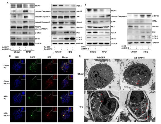 Autophagy has been found to play a critical role in cellular metabolism and can also maintain the function of mitochondria and the endoplasmic reticulum. Therefore, impaired autophagy caused by aging and obesity with lipid overload can lead to β-cell dysfunction [55]. Impaired autophagic flux was also found to be closely associated with lipotoxicity-induced β-cell dysfunction, endoplasmic reticulum stress, oxidative stress, inflammation, and mitochondrial dysfunction [10]. Herein, we demonstrated that the 3-MA- or PA-induced autophagic inhibition was alleviated by MKP-5 overexpression. Most importantly, MKP-5 overexpression was able to suppress apoptosis, dysfunction, endoplasmic reticulum stress, oxidative stress, and inflammation in Rin-m5f cells. Furthermore, we confirmed that the overexpression of MKP-5 alleviated impaired autophagic flux by reducing the inhibition of autophagosome-to-autolysosome conversion in Rin-m5f cells. This result was further confirmed based on changes in the levels of the autophagic markers P62, Beclin-1, and LC3-II in these cells. MAPK signaling has been reported to be involved in the regulation of autophagy [20]. Notably, the treatment of Rin-m5f cells with a JNK or P38 inhibitor was sufficient to normalize the expression of autophagic proteins that had been altered by 3-MA and PA, especially in the context of MKP-5 overexpression. However, it still remains uncertain as to whether or not HFD plays a role in inhibiting autophagic flux [56,57]. In our ex vivo study, MKP-5 also rescued HFD-inhibited autophagic flux by increasing both the formation of autophagosomes and the degradation of autolysosomes. Therefore, the results suggest that MKP-5 can alleviate obesity-inhibited autophagy in islet cells via the JNK and P38 pathway.