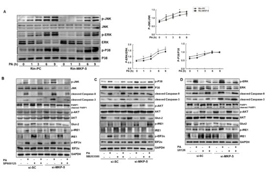 Rin-m5f cells were transfected with small interfering RNA (siRNA) against MKP-5 (si-MKP-5, Stealth RNAi siRNA, Catalog #1330001) or a negative control scramble siRNA (si-SC, Stealth RNAi siRNA Negative Control, Catalog #12935300) using Lipofectamine RNAiMAX according to the manufacturer’s instructions in order to achieve a final siRNA concentration of 20 nM. For the experiments involving MAPK inhibition, Rin-m5f cells transfected with these siRNAs were preincubated with SP600125 (JNK inhibitor, 50 μM), SB203580 (P38 inhibitor, 5 μM), or U0126 (ERK inhibitor, 5 μM) for 1 h; then, they were stimulated with PA plus the above inhibitors for another 9 h, and proteins were prepared for Western blotting.