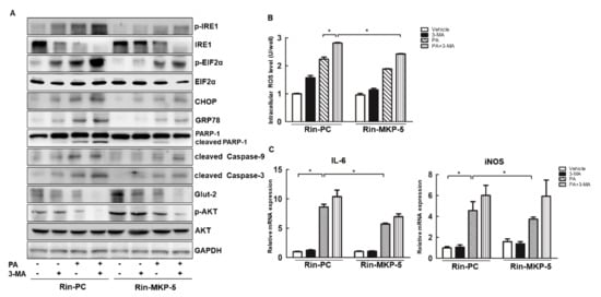 In addition, we also observed that 3-MA treatment inhibited the expression of p-AKT and Glut-2, especially in the presence of PA in Rin-PC cells. Consistent with this, MKP-5 overexpression reversed 3-MA-induced autophagic inhibition as evidenced by changes in Glut-2 and p-AKT levels in the presence or absence of PA treatment (Figure 8A). This suggests that MKP-5 alleviated PA-induced apoptosis and dysfunction via rescuing autophagic signaling. In accordance with this increased point on obesity-related diabetes, the role of autophagy in the regulation of inflammatory and oxidative stress started to emerge [13,42,43]. We found that 3-MA treatment promoted ROS production in the presence or absence of PA in Rin-PC cells, while MKP-5 overexpression rescued 3-MA-mediatedincreases in ROS levels in PA-treated cells (Figure 8B). We have also shown that MKP-5 alleviated PA-induced inflammation in Rin-m5f cells (Figure 2D). Thus, our results confirm that autophagy was involved in this process. Surprisingly, 3-MA treatment alone did not alter the levels of inflammatory cytokines, such as IL-6 and iNOS in Rin-PC cells (Figure 8C). Nevertheless, MKP-5 overexpression reduced the levels of IL-6 and iNOS induced by the combination 3-MA + PA treatment in Rin-MKP-5 cells (Figure 8C). Collectively, these above results suggest that MKP-5 mediates PA-induced apoptosis, ERS, dysfunction, oxidative stress, and inflammation via the autophagy pathway.