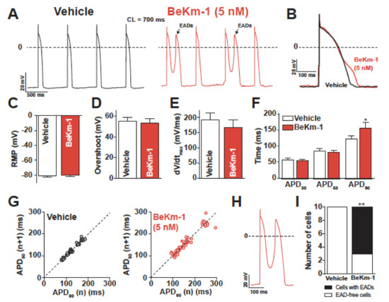 Although the effect of BeKm-1 on APD90 was expected from a block of hERG channels, the other effects (i.e., membrane depolarization, reduction in AP frequency, and decrease of maximal upstroke velocity) are most likely a secondary consequence of the absence of IK1 in hiPS-CMs due to incomplete maturation level of these cells during the differentiation process (a recurrent problem in differentiating hiPS into cardiomyocytes). The 5 nM concentration of BeKm-1 was chosen to spare a fraction of the hERG channels in these cells. Therefore, we also tested a higher concentration (100 nM) in order to affect all hERG channels. As shown on the representative trace, 100 nM BeKm-1 produced a complete beating arrest by a major membrane depolarization that was sufficient to inactivate Nav1.5 and Cav1.2 channels (Figure 2I). This observation is coherent with the fact that a stronger IK1 current would be needed in hiPS-CMs to maintain a more negative membrane potential typical for CMs. Hence, to get a more realistic hint of how BeKm-1 effects would be circumscribed in a more mature human cardiomyocyte, we also used dynamic clamp, which is a technique that can simulate the presence of IK1 in these cells. In this technique, a current density of 2.8 pA/pF is injected in order to successfully reach an RMP value of −80 mV. Those cells that did not reach this RMP value were rejected from the analyses. Representative APs, paced at a constant cycling length of 700 ms with IK1, are shown before and after the application of 5 nM BeKm-1 (Figure 3A,B). In these conditions, hiPS-CMs showed the occurrence of APs with EADs (Figure 3A), which are events not observed on spontaneously beating cardiomyocytes. Logically, these APs were excluded from further analysis of AP parameters. IK1 in silico injection efficiently allowed for setting a real resting membrane potential (RMP) at −80 mV in these hiPS-CMs, causing the cessation of spontaneous APs (not shown). As a result of IK1 taking the relay over IKr, there was no effect of 5 nM BeKm-1 on RMP (Figure 3C). Consistent with the fact that depolarizing channels can fully recover at these transmembrane potentials, no significant effect was observed on the overshoot (Figure 3D), nor on the maximal upstroke velocity (Figure 3E). As expected from a late implication of hERG channels in the AP, and in coherence with experiments on spontaneous APs, BeKm-1 did not alter the APD30 and APD50, but it significantly prolonged the APD90 from 121.9 ± 11.0 ms (vehicle, n = 10) to 156.7 ± 16.9 ms (BeKm-1, n = 10; 29% prolongation on average), which were all measured at a constant cycle length and MDP (Figure 3B,F). In addition, cells dynamically clamped with IK1 also showed greater APD90 variability after treatment with 5 nM BeKm-1 (Figure 3G). The average prolongation of APD90 and variability is also detailed cell by cell (Figure S3).