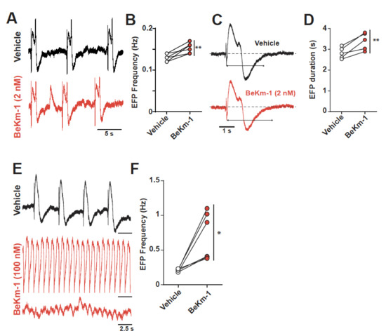 Concentration-dependent impact of BeKm-1 on electric field potential (EFP) properties of a hiPS-CMs monolayer. (A) Raw traces of representative EFPs showing a decrease of the frequency following a 2 nM BeKm-1 application. (B) Frequency quantification before and after treatment with 2 nM BeKm-1. (C) Expanded representative EFP showing prolonged duration following treatment with 2 nM BeKm-1. (D) Quantification of EFP duration before and after 2 nM BeKm-1 application. n = 5 independent hiPS-CMs monolayers. Paired t-tests with **, p < 0.01. (E) Raw traces of representative EFPs before and after 100 nM BeKm-1 application showing increase in beats frequency and fibrillation-like pattern. (F) Quantification of EFP frequency before and after treatment with 100 nM BeKm-1. n = 6 independent hiPS-CMs monolayers (5 sweeps of 30 s for each). Paired t-tests with *, p < 0.05.