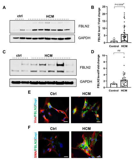 Further, immunofluorescence and confocal imaging analysis of three representative cultured fibroblasts derived from HCM patients showed elevated FBLN2 levels, compared to control fibroblasts. The protein was localized to the cell matrix. Cells were co-stained with FBLN2 and fibroblasts markers (vimentin and SMA) to confirm cells’ purity (Figure 3E,F).
