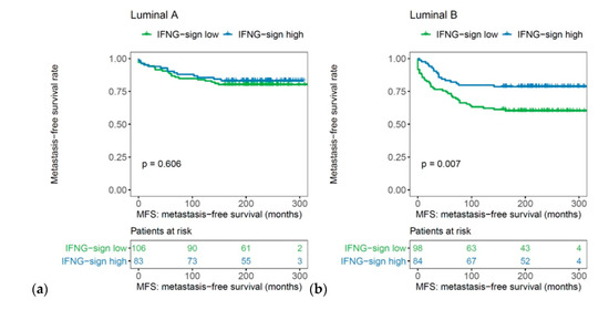 In subtype analysis, the prognostic effect of the IFN-γ signature was particularly pronounced in the luminal B (p = 0.007, log rank), HER2-positive (p = 0.033, log rank), and basal-like molecular subtype (p = 0.050, log rank), but not in the Luminal A breast cancer samples (Figure 5).