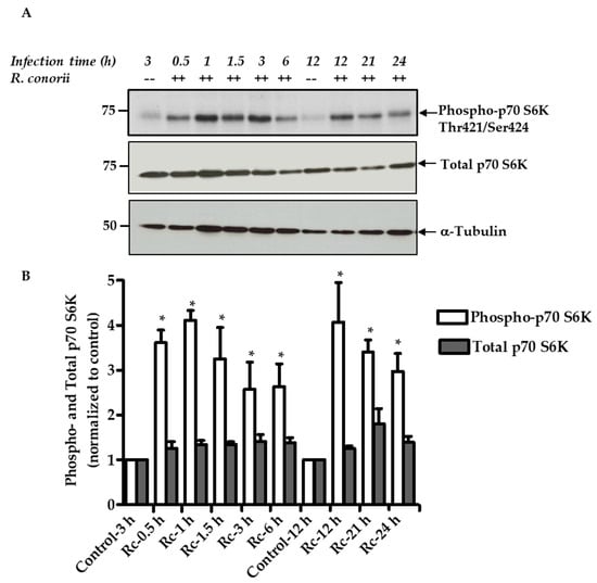 The mTOR pathway plays an important role in the regulation of host metabolism and protein translation in response to changing environmental conditions and the need for immunoregulation [12,13]. To investigate the activation of mTORC1 during EC infection with Rickettsia species, total protein lysates from R. conorii-infected ECs were subjected to Western blot analysis to investigate phosphorylation of a known mTORC1 substrate, namely p70 S6 kinase (p70 S6K). Cellular levels of p70 S6K phosphorylation in mock-infected ECs were very low to almost negligible as expected, but clearly abundant and significantly higher in response to R. conorii infection. The expression of total p70 S6K, however, remained relatively unaltered throughout the course of infection (Figure 1A). Quantitative analysis presented in Figure 1B clearly suggests an increase of about 3- to 4-fold in steady-state levels of phospho-p70 S6K on threonine 421/serine 424 in infected cells as early as 0.5 h and sustenance of this response up to 24 h post-infection in direct comparison to corresponding mock-infected controls (Figure 1A). These findings indicate activation of mTORC1 in response to in vitro R. conorii infection of human ECs.