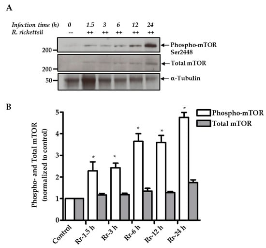 Finally, we investigated the phosphorylation of mTOR itself on serine 2448 as a direct indicator of activation using an antibody capable of detecting phospho-mTOR. As shown, we noticed a pattern of time-dependent increase from 1.5 to 24 h (5.0 ± 0.5-fold) in the steady-state levels of mTOR phosphorylation in infected cells in direct comparison to mock-infected controls (Figure 3A). Again, the levels of total mTOR remain relatively unchanged through the course of infection. Further quantitative analysis from three independent experiments is depicted in Figure 3B. Thus, our findings clearly establish that in vitro infection of host ECs by pathogenic spotted fever rickettsiae induces the activation of both mTOR complexes designated as mTORC1 and mTORC2.