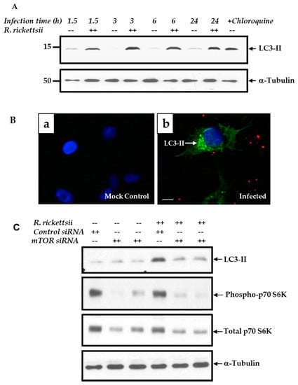 Autophagy represents a fundamentally important regulatory mechanism resulting in the recycling of cellular constituents by lysosomes. Studies have shown involvement of a number of signal transduction pathways in the regulation of autophagy, including those converging at the mTOR, which is now well appreciated for a major role in the regulation of autophagy. Therefore, to investigate the potential link between mTOR and host cell autophagy in the context of rickettsial infection, we investigated the initial step in the activation of autophagic cascade by analyzing lipidation of microtubule-associated protein 1A/1B-light chain 3 (LC3-II). As shown in Figure 4A, LC3-II lipidation was enhanced in response to infection at all studied time points between 1.5 and 24 h post-infection, in comparison to simultaneously processed mock-infected controls. Treatment of cells with chloroquine was used as a positive control in these experiments. As the next step, mock- and R. rickettsii-infected ECs were stained for LC3-II to visualize the formation of autophagosomes. There was clear evidence for the formation of LC3-II puncta in infected cells (stained green and indicated by an arrow), while being absent or barely noticeable in the corresponding mock-infected controls (Figure 4B). The cell nuclei and rickettsiae in infected cells are clearly identifiable by blue and red fluorescence, respectively. Together, these findings yield further evidence suggesting that rickettsial infection triggers initial autophagic response in host ECs. To determine further whether induction of the autophagy cascade is governed by mTOR, we transfected ECs with either mTOR-specific or a control siRNA for 48 h prior to infection of cells with R. rickettsii and analysis of LC3-II lipidation. Interestingly, mTOR siRNA significantly downregulated the intensity of LC3-II lipidation in R. rickettsii-infected ECs as compared to mock-transfected controls (Figure 4B). To ensure the functionality of siRNA used, we also assessed cellular levels of both phospho- and total p70 S6 kinase to validate the attenuation of its phosphorylation in cells transfected with mTOR-specific, but not scrambled control siRNA (Figure 4C).
