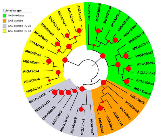 Phylogenetic analysis of GA20oxs, GA3oxs, and GA2oxs in A. thaliana (At) and M.truncatula (Mt). The proteins are grouped into four distinct groups. The phylogenetic tree was constructed using 39 protein sequences from A. thaliana (16) and M.truncatula (23) on iTOLv5 (Interactive Tree of Life; https://itol.embl.de/) online website. The red dots of different sizes (Min size: 5 px; Max size: 30 px) represent the bootstrap values, ranging from 0.5 to 1. The branches covered by different color represent the four group proteins.