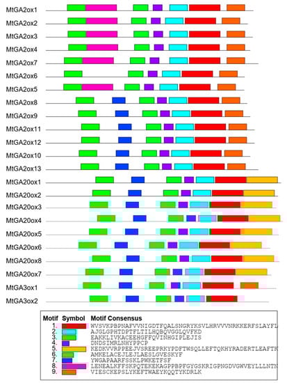 Motifs composition of the MtGA20ox, MtGA3ox, and MtGA2ox proteins. The conserved motifs are predicted by MEME. The different motifs are represented by colored boxes. Motif 3 is representative DIOX_N domain. Motif 1 and motif 2 are representative 2OG-FeII_Oxy domain.