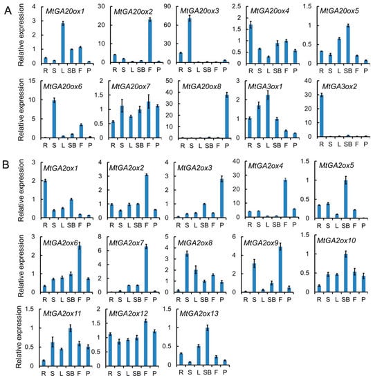 The expression patterns of MtGA20ox, MtGA3ox, and MtGA2ox genes in M. truncatula. (A) Expression analysis of gibberellin biosynthesis genes MtGA20ox and MtGA3ox in different tissues. (B) Expression analysis of gibberellin deactivation genes MtGA2ox in different tissues. R, roots; S, stems; L, leaves; SB, shoot buds; F, flowers; P, pods. The level of expression was normalized to M. truncatula UBI gene. Error bars represent SD for three biological replicates.