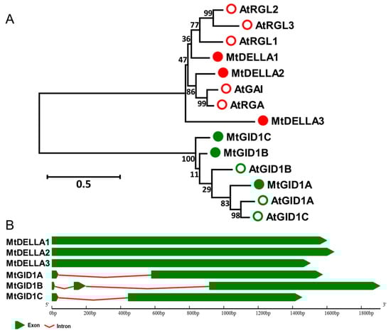 Phylogenetic tree analysis and exon-intron structures of the DELLA and GID1 gene family. (A) Phylogenetic analysis of DELLA and GID1 proteins from A. thaliana and M. truncatula. The tree is generated with MEGA 7.0 software using the Neighbor-Joining (NJ) method. The bootstrap analysis was conducted with 1000 iterations. The values on the phylogenetic tree represent the result of bootstrap analysis conducted with 1000 iterations. The scale bar indicates that the sequence divergence is 0.05 per unit bar, which represent 5% substitutions per nucleotide position. The empty and full circles in red color represent A. thaliana and M. truncatula DELLA proteins and the empty and full circles in green color represent A. thaliana and M. truncatula GID1 receptor proteins (B) The gene structures of the MtDELLAs and MtGID1s. Exons are represented by green boxes; introns are shown as red lines.