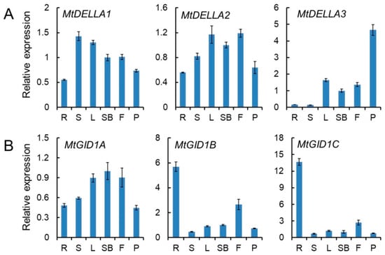 Expression patterns of MtDELLA (A) and MtGID1 (B) genes in six different tissues. R, roots; S, stems; L, leaves; SB, shoot buds; F, flowers; P, pods. The level of expression was normalized to M. truncatula UBI gene. Error bars represent SD for three biological replicates.