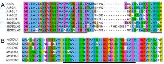 Multiple Sequence alignment of DELLA, VHYNP and SIM domains in DELLA and GID1 proteins. (A) DELLA and VHYNP domain sequences alignment for DELLA homologues in A. thaliana and M. truncatula. Black lines indicate the DELLA (left) and VHYNP (right) domain. (B) SUMO-Interaction Motif (SIM) sequences alignment for GID1 homologues in A. thaliana and M. truncatula. The black line indicates the SIM motif (W[V/I]LI). Amino acids that are conserved throughout are shaded in different colors.