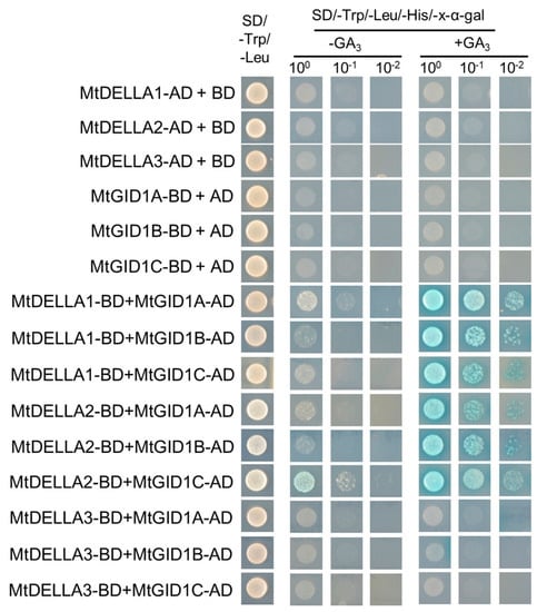 The yeast two-hybrid assay was performed using the Gold System (Clontech, Mountain View, CA, USA). The coding sequence of MtDELLA1, MtDELLA2, and MtDELLA3 were cloned into the pGADT7 and pGBKT7 vectors, and the coding sequences of MtGID1A, MtGID1B, and MtGID1C were cloned into the pGADT7 and pGBKT7 vectors using the Gateway system. The bait and prey plasmids were co-transformed into yeast strain AH109. For the auxotrophic assay, yeast colonies were inoculated onto SD/-Trp/-Leu and SD/-Trp/-Leu/-His/-Ade plates with or without 10−5 M GA3 and incubated in the dark at 28°C for 3 days. The initial concentration of the yeast cells spots on both SD/-Trp/-Leu and SD/-Trp/-Leu/-His/-Ade plates were OD600 = 0.2. Then, yeast cells were diluted 10 and 100 times and spotted on SD/-Trp/-Leu/-His/-Ade selective media for detail interaction test analysis. All primers used are listed in Table S3.