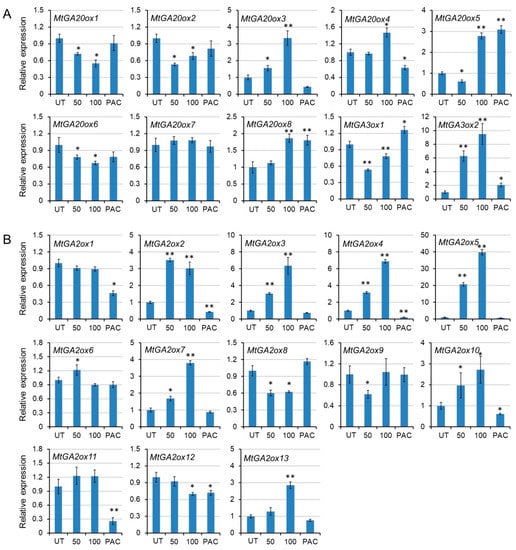 The transcript levels of MtGA20ox, MtGA3ox, and MtGA2ox are regulated by gibberellin 3 (GA3) and its inhibitor paclobutrazol (PAC) through a feedback mechanism. (A) The transcript levels of MtGA20ox and MtGA3ox are regulated by GA3 and PAC. (B) The transcript levels of MtGA2ox are regulated by GA3 and PAC. Leaves are treated with 50 and 100 μM GA3, and 10 μM PAC. Gene expression is normalized to the control untreated (UT) expression level. Data represent the average of three independent experiments ± SD. * p < 0.05, ** p < 0.01.