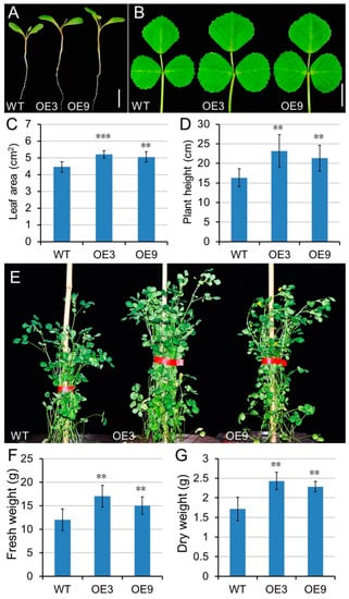 Overexpression of MtGA20OX1 promoted biomass production. (A,B) The cotyledeon and leaf phenotypes of the wild type and MtGA20OX1 transgenic lines. (C) Measurements of the blade area of compound leaves on the fifth node of 4-week-old WT and MtGA20OX1 transgenic plants (means ± SD; n = 5). (D) The plant height of MtGA20OX1 transgenic and wild type plants within 50 days (means ± SD; n = 13). (E) Morphology of wild-type (WT) and MtGA20OX1 overexpressing M. truncatula plants. (F,G) The fresh and dry weight of developing wild type and MtGA20OX1 transgenic plants (means ± SD; n = 10). Bars = 1 cm in A and B. ** p < 0.01, *** p < 0.001.