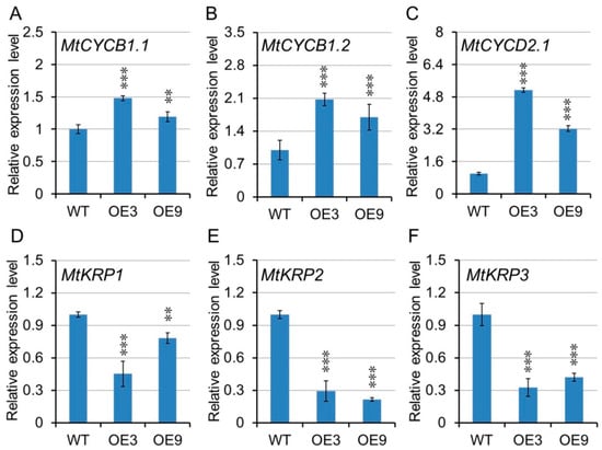 Expression analysis of cell development related genes in wild-type and MtGA20OX1 transgenic lines. (A–C) The expression of cyclindependent protein kinase genes, MtCYCB1.1, MtCYCB1.2, and MtCYCD2.1. (D–F) The expression of MtKRP1, MtKRP2, and MtKRP3 genes. ** p < 0.01, *** p < 0.001.