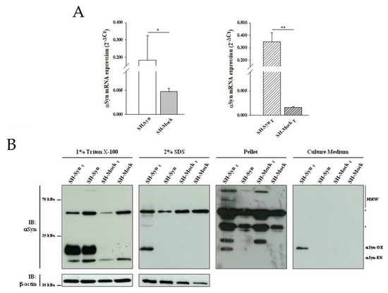 αSynuclein (αSyn) expression in SH-SY5Y cells stably overexpressing αSyn (SH-Syn) and SH-SynT. (A) αSyn mRNA quantification by qPCR in SH-Syn and control cells (SH-Mock) (left panel) and in SH-SynT and SH-MockT (right panel). Data are presented as the means ± SD from three independent experiments, each performed in duplicate. Data were analyzed by a two-tailed Student t-test (* p < 0.05; ** p < 0.001). (B) Detection of αSyn in the 1% Triton X-100 soluble fraction, in the 2% SDS soluble fraction, in the pellet fraction, and in the cell culture medium of SH-Syn, SH-SynT, SH-Mock, and SH-MockT. Blots are representative of experiments repeated three times. β-actin was used as the loading control; an asterisk represents non-specific bands.