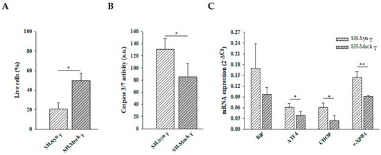 Cell viability, executioner 3/7 caspase activity, and UPR induction in SH-SynT. (A) Live cell count by Trypan blue staining of SH-SynT and SH-MockT. Data are presented as the means ± SD from three independent experiments, each performed in triplicate. Data were analyzed by a two-tailed Student’s t-test (* p < 0.05). (B) Analysis of caspase 3/7 activity in SH-SynT and SH-MockT. Data are presented as the means ± SD from two independent experiments, each performed in triplicate. Data were analyzed by a two-tailed Student’s t-test (* p < 0.05). (C) BiP, ATF4, CHOP, and r-XBP1 mRNA quantification by qPCR in SH-SynT and SH-MockT. Data are presented as the mean ± SD of three independent experiments, each performed in duplicate. Data were analyzed by a Mann–Whitney Rank Sum Test (* p < 0.05, ** p < 0.001).