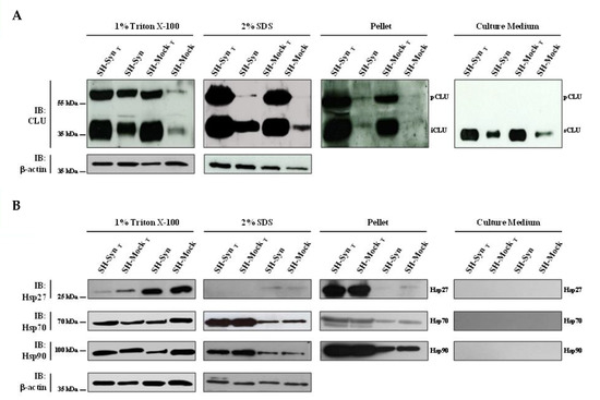 Chaperone protein level in SH-Syn and SH-SynT. Detection of (A) CLU and (B) Hsp27, Hsp70, and Hsp90 in the 1% Triton X-100 soluble fraction, in the 2% SDS soluble fraction, in the pellet fraction, and in the culture media of SH-Syn, SH-SynT, SH-Mock, and SH-MockT. Blots are representative of experiments repeated three times. β-actin was used as the loading control.