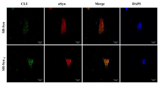 Localization of CLU and αSyn in SH-Syn and SH-SynT. Representative images of the intracellular localization of CLU (green fluorescence) and αSyn (red fluorescence) in SH-Syn and SH-SynT acquired by confocal microscopy. Cell nuclei were stained with 4′dye-6˗diamidino˗2˗phenylindole (DAPI, blue fluorescence). Magnification 40×.