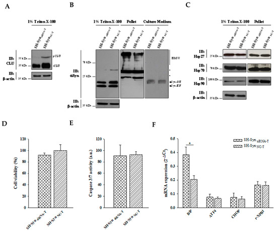 When CLU down-regulation was combined with MG132 treatment (Figure 9A and Figure S5B), we observed a different distribution of αSyn in the analyzed fractioning buffers. In particular, αSyn’s HMW form levels were markedly increased in the pellet, while the monomeric αSyn form slightly decreased in the 1% Triton X-100 soluble fraction of the treated SH-SynsiRNA (SynsiRNA-T) compared to the treated SH-SynNC (SH-SynNC-T). As expected, αSyn was also detected in the extracellular environment but without a significant difference between SH-SynsiRNA-T and SH-SynNC-T (Figure 9B). Under these conditions, we found that CLU down-regulation was not accompanied by significant changes of the other chaperones investigated in this study (Figure 9C). Lastly, we observed a significant increase of Bip expression in SH-SynsiRNA-T compared to SH-SynNC-T, without a significant increase of the other effectors involved in the UPR (Figure 9F). Likewise, cell viability (Figure 9D) and caspase 3/7 activities (Figure 9E) were not significantly affected by CLU down-regulation.
